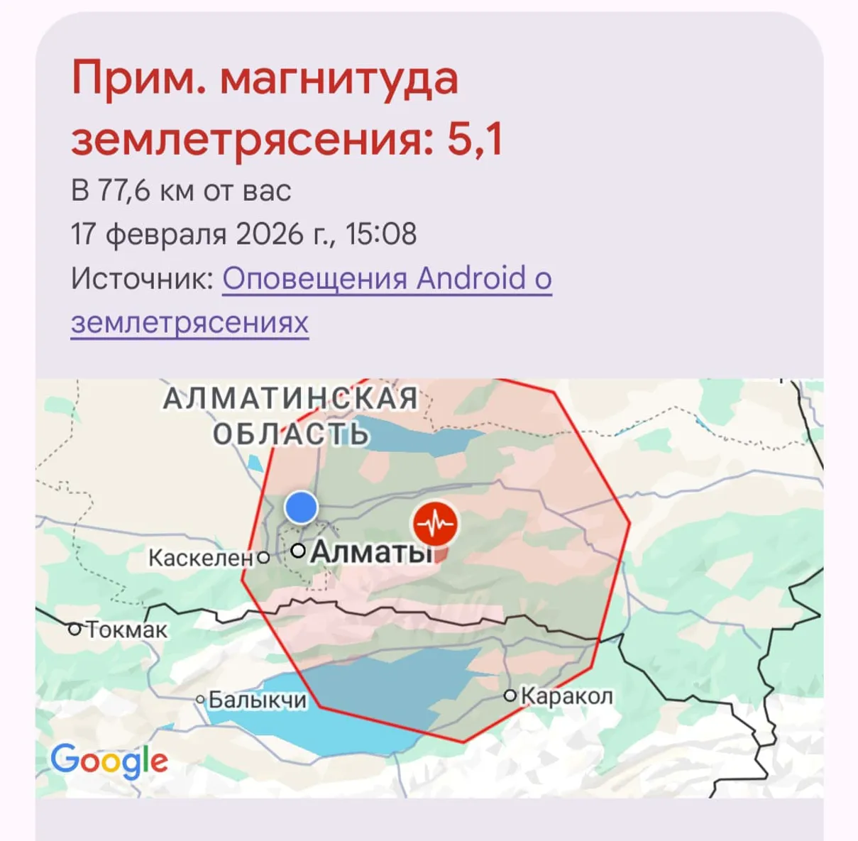 17 февраля 2026 года в 15:11 по времени Астаны сеть сейсмических станций ТОО «ННЦСНиИ» МЧС РК зафиксировала подземные толчки на территории Казахстана, в 74 км на восток от Алматы, сообщает QazMonitor.